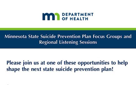 Minnesota Suicide Prevention Conference Don’t miss the first annual conference – register now! The inaugural Minnesota Suicide Prevention Conference will bring together suicide prevention professionals, coalition leaders, public health staff, government staff, mental health professionals, and community leaders for two days of learning, networking and skill-building to enhance suicide prevention efforts across the state. The […]