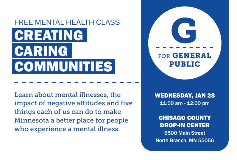 NAMI Minnesota (National Alliance on Mental Illness) will be coming to the North Branch Drop-in Center and presenting on Creating Caring Communities, on January 28th at 11 am. This has been a topic of conversation at the Local Advisory Council, following discussion on personal experiences within our community.