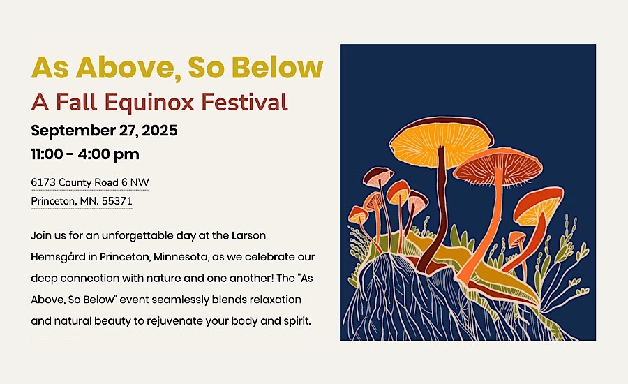 Here’s a nature rich event that celebrates the fall equinox by engaging people in a variety of therapeutic nature based activities at Prairie Star Care Farm near Princeton. This farm has hosted the "Growing Resilience" program this summer, providing mental health support to individuals living in the counties served by AMHI.