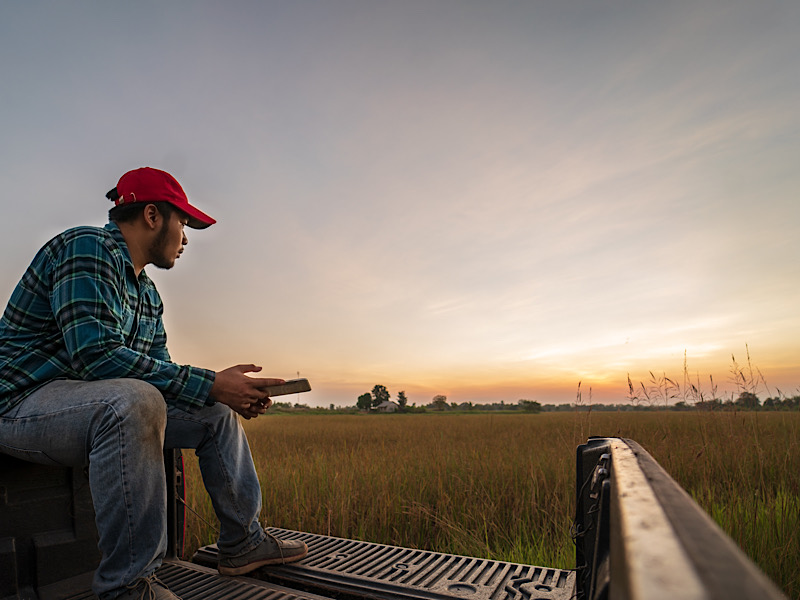 Farmer, agribusiness Plan rice harvesting with internet data in tablet 5G digital farmer