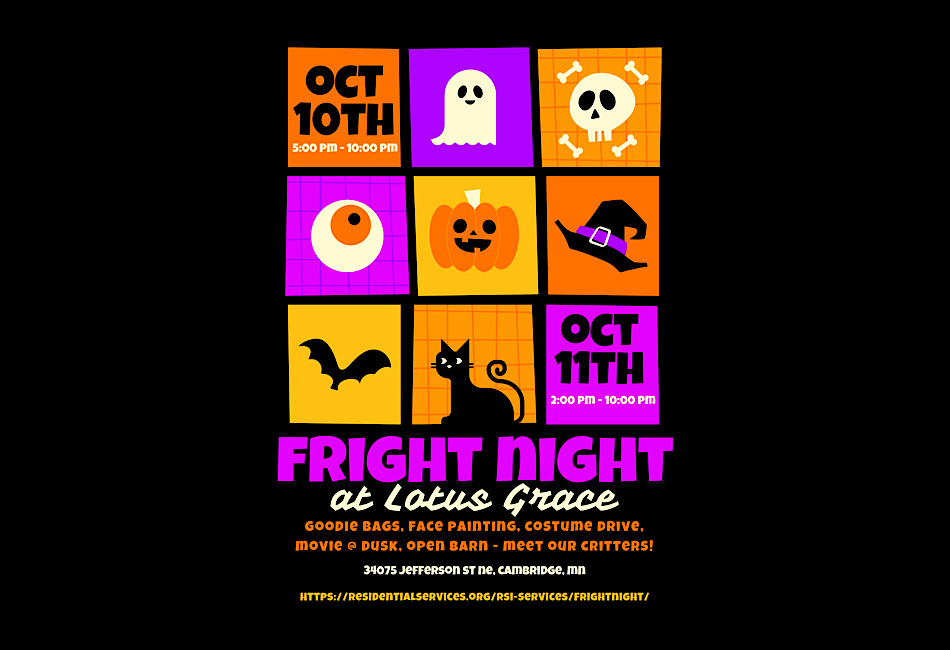 Fright Night was started at RSI in 2020 as a free & accessible all-ages community event featuring tours of our 20-acre hobby farm, a haunted hayride, walks through lots of spooky scenes featuring a host of creepy characters, and more!