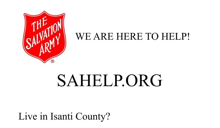 GreetingThe Salvation Army has launched a NEW website to make it easier for Isanti County residences to seek assistance. The new website, SAHELP.ORG, is easy to navigate and confidential. Please feel free to print, post and/or forward the attached flyer.