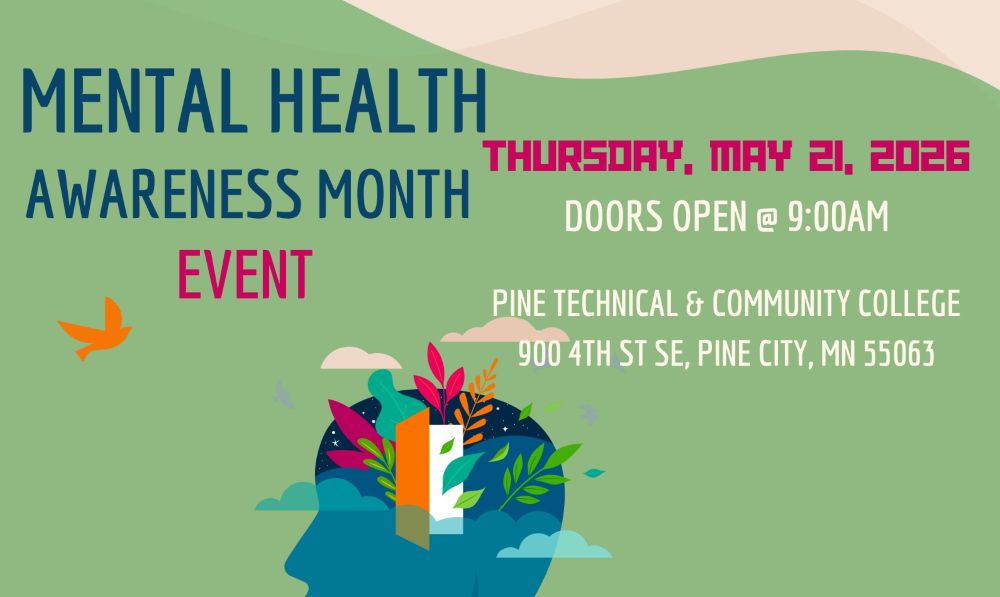 The Pine County Behavioral Health Unit is hosting our 4th annual Mental Health Awareness Event on May 21st at the Pine Technical Community College. Event is free to public 18+ and registration is open until May 14th 2026 or until filled to capacity.