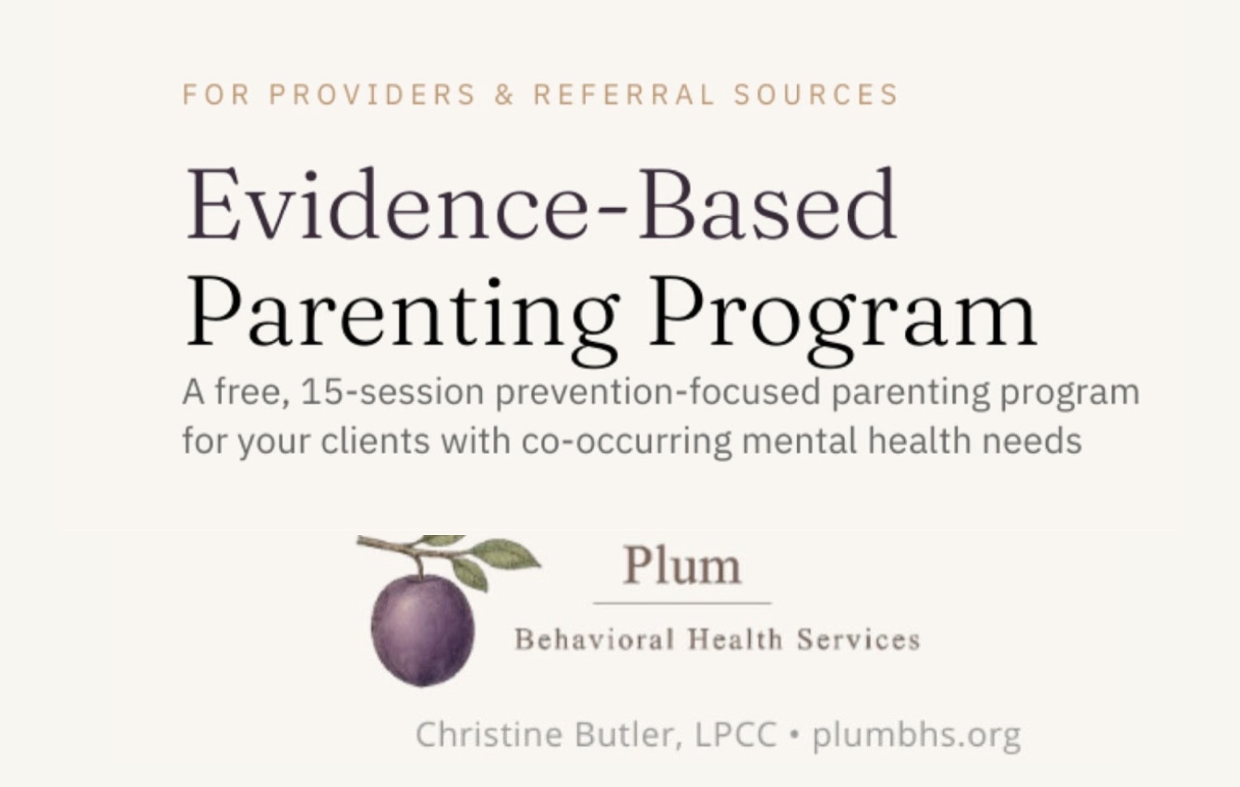 Available openings in the Friday, IN PERSON, Evidence Based Parenting Skills Program provided by Plum Behavioral Health Services. The program has a rolling referral structure, and it is not too late to refer!