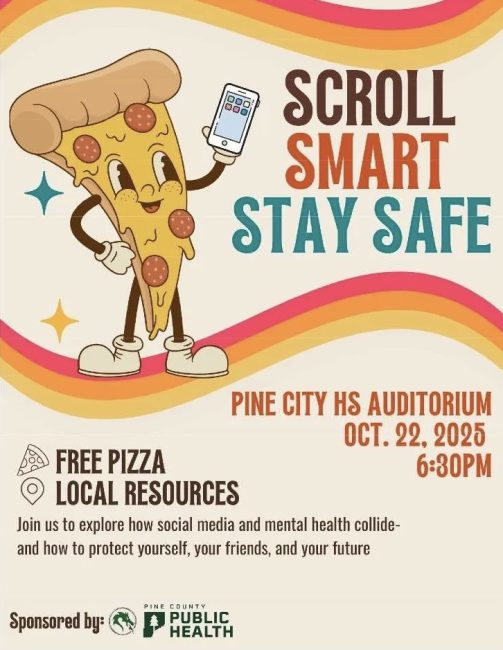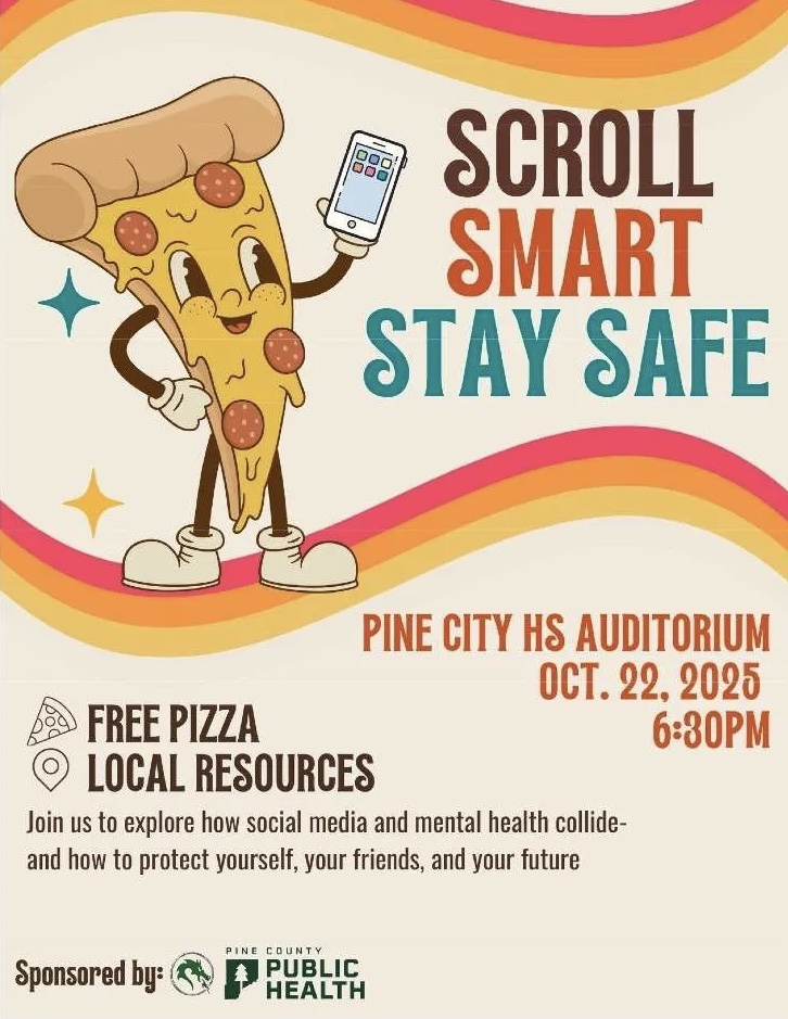 Pine City Schools & Pine County Public Health are partnering together to present this “Scroll Smart. Stay Safe” workshop for parents and teens. Explore how social media and mental health collide — and learn important ways to protect yourself, your friends and your future.