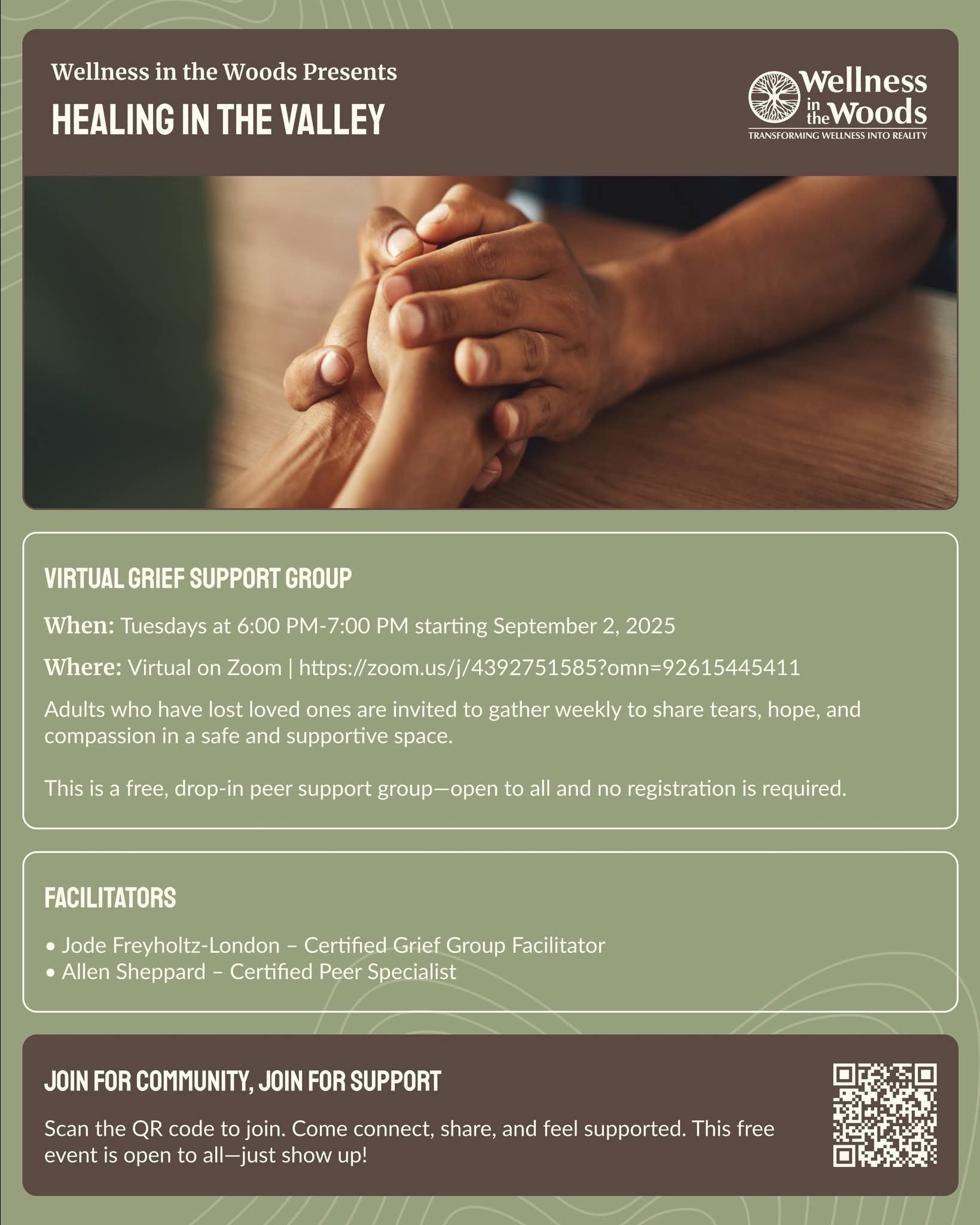 Scan the QR code to join. Come connect, share, and feel supported. This free event is open to all – just show up!